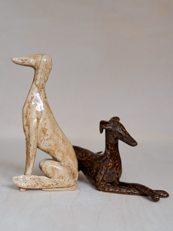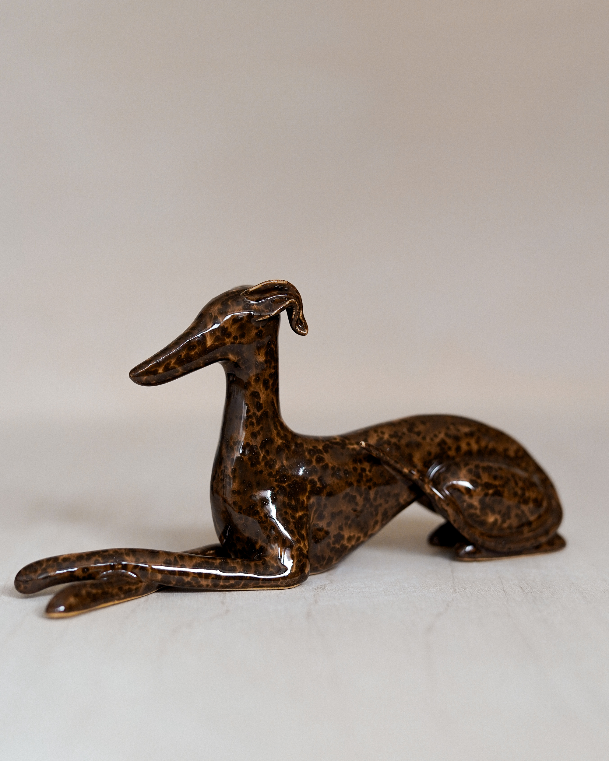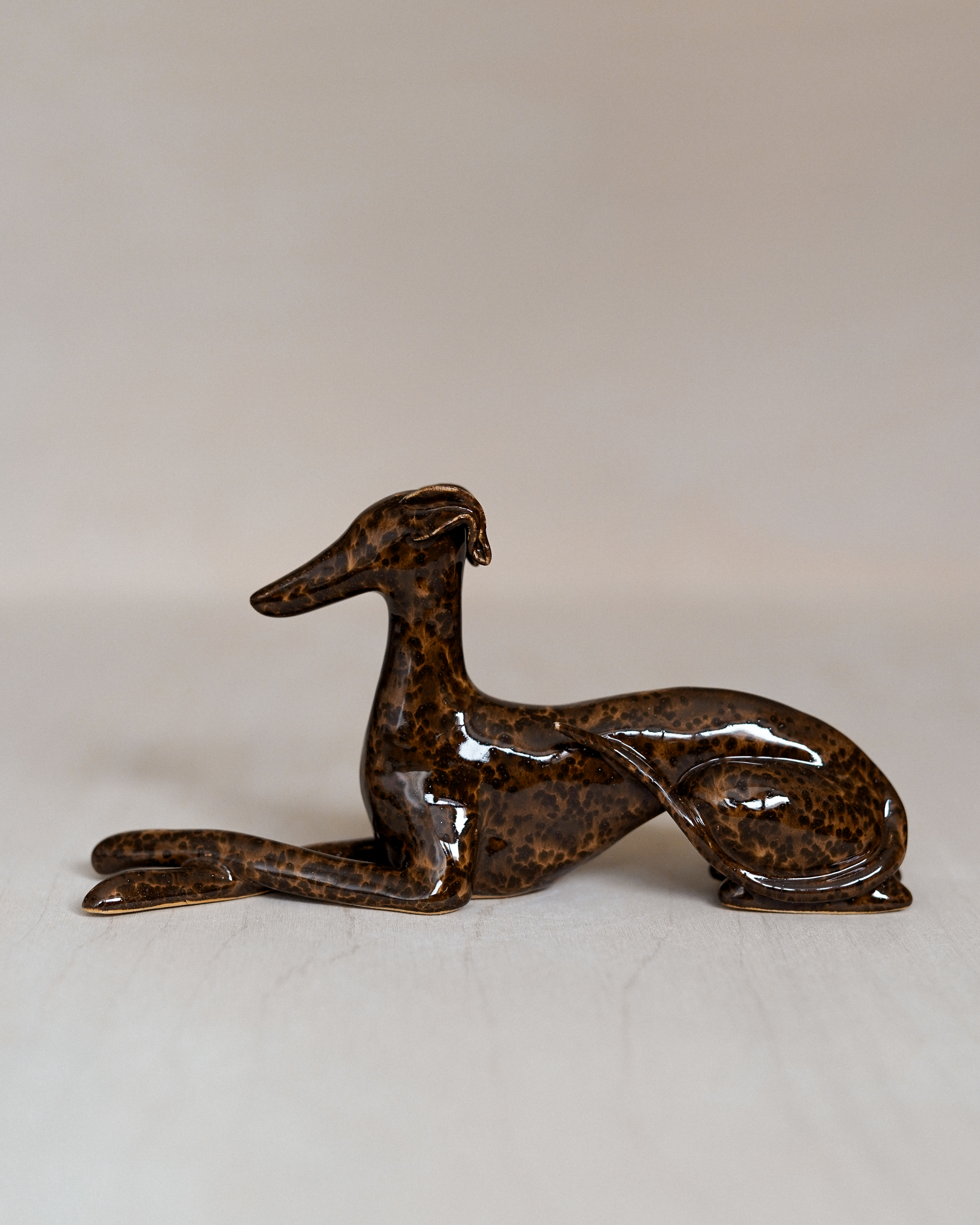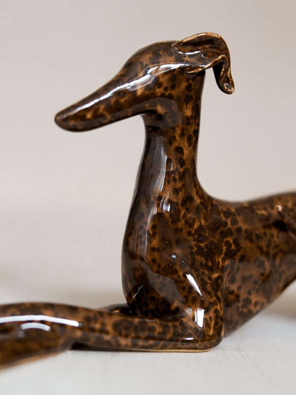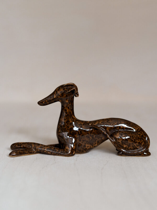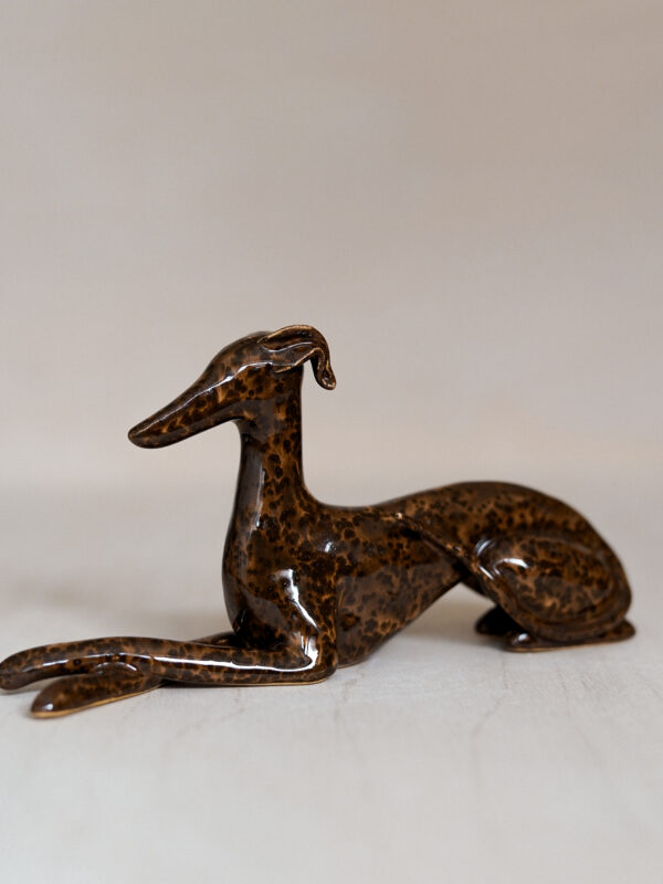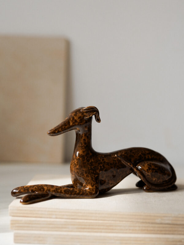 Ceramic figurine – lying sighthound, covered in glossy brown spotted glaze. All the figurines are sculpted by me from scratch and each of them has an individual number – there are no two identical Clayhounds! mPlease remember that as a handicraft this sculpture can have some tiny imperfections or asymmetries – but those are the details that make it unique 🙂