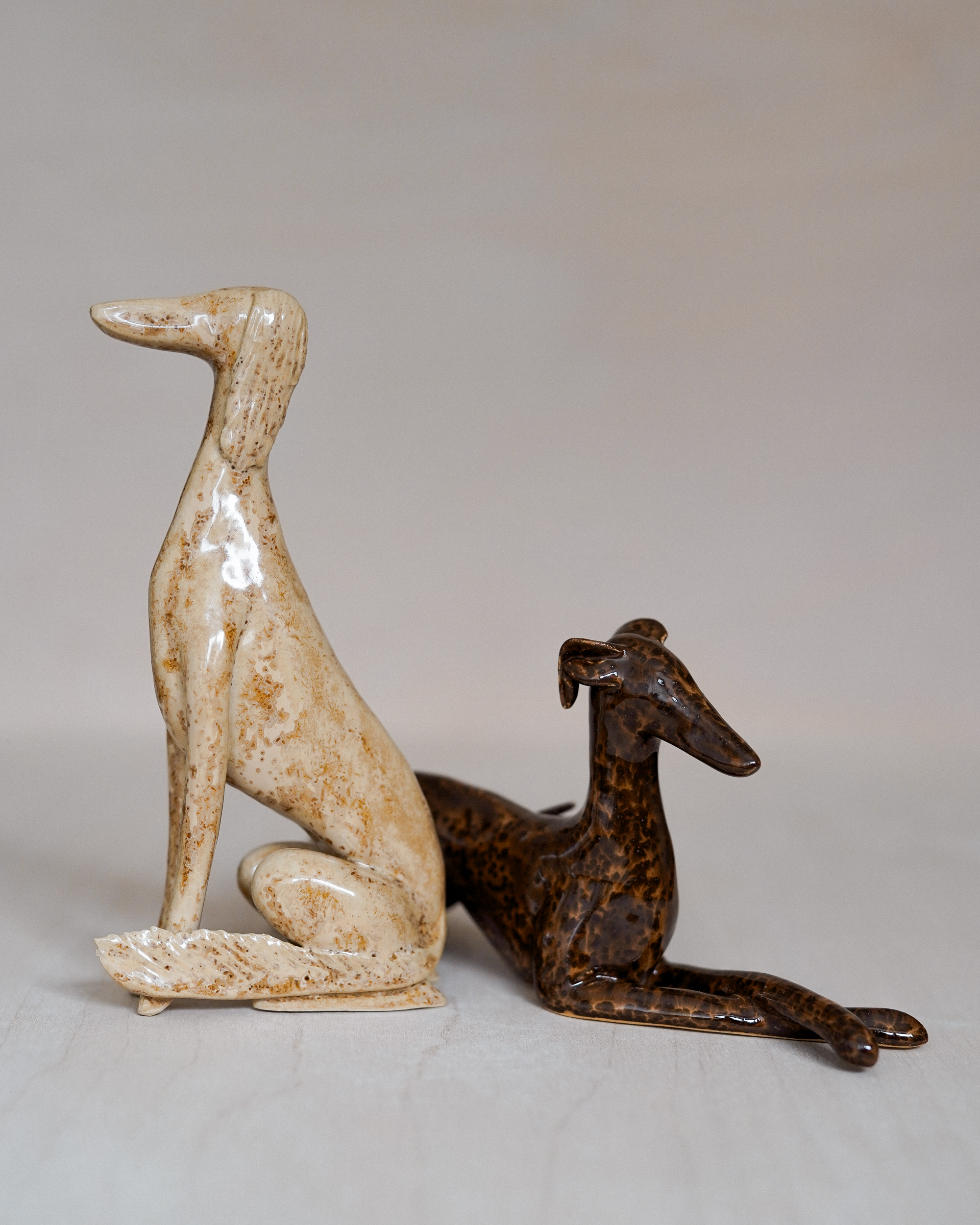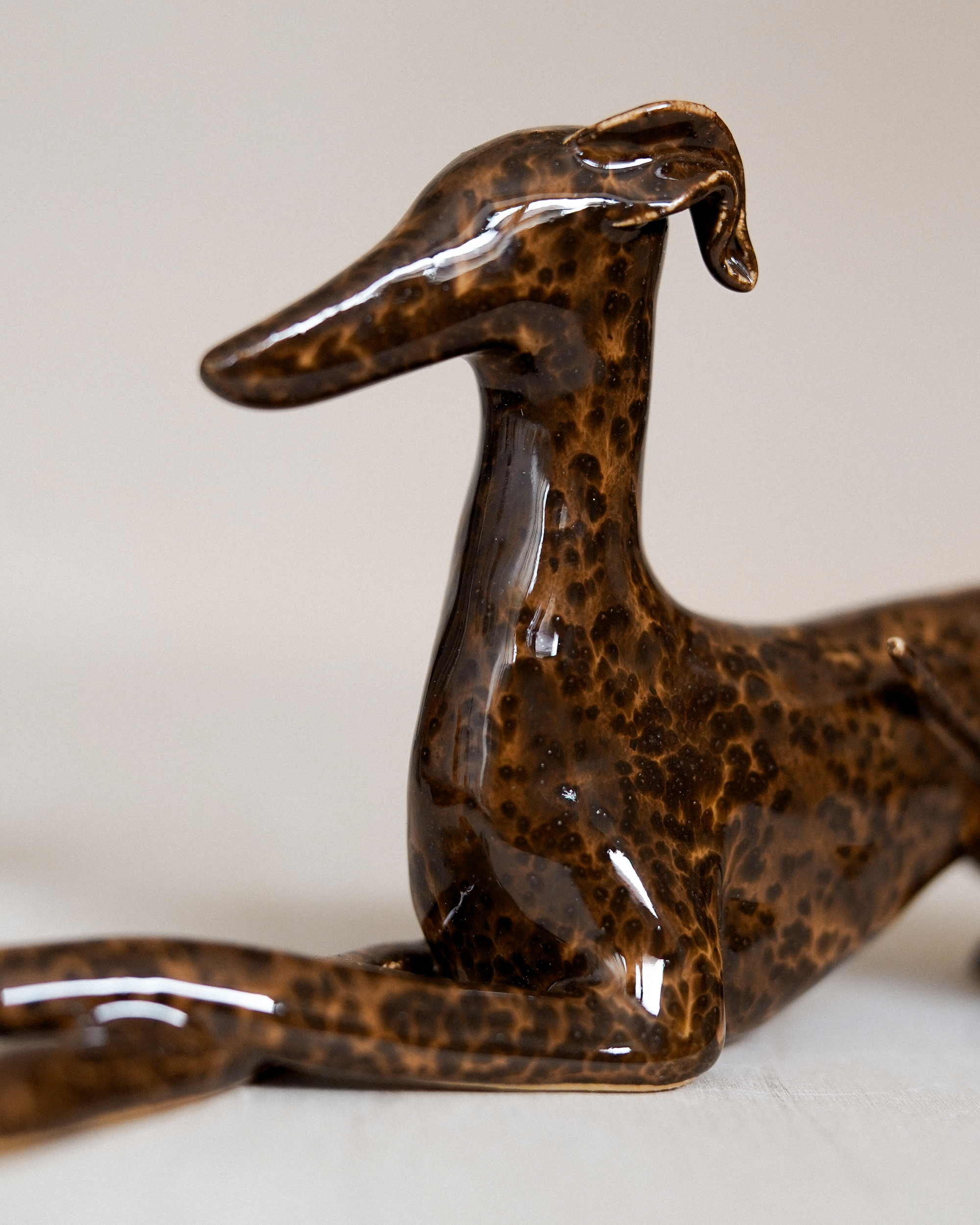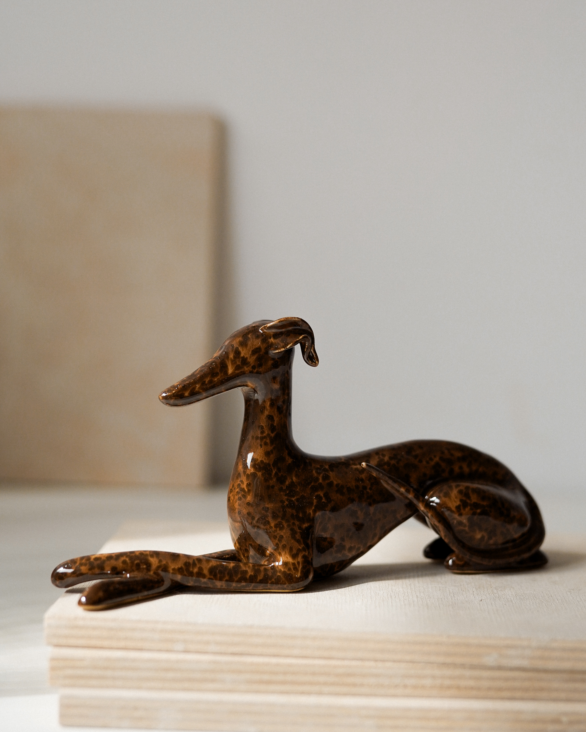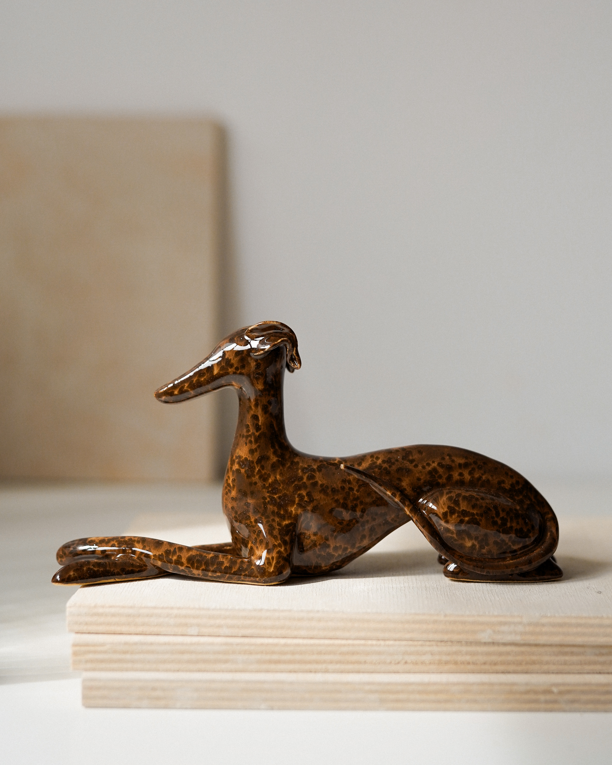 Ceramic figurine – lying sighthound, covered in glossy brown spotted glaze. All the figurines are sculpted by me from scratch and each of them has an individual number – there are no two identical Clayhounds! mPlease remember that as a handicraft this sculpture can have some tiny imperfections or asymmetries – but those are the details that make it unique 🙂