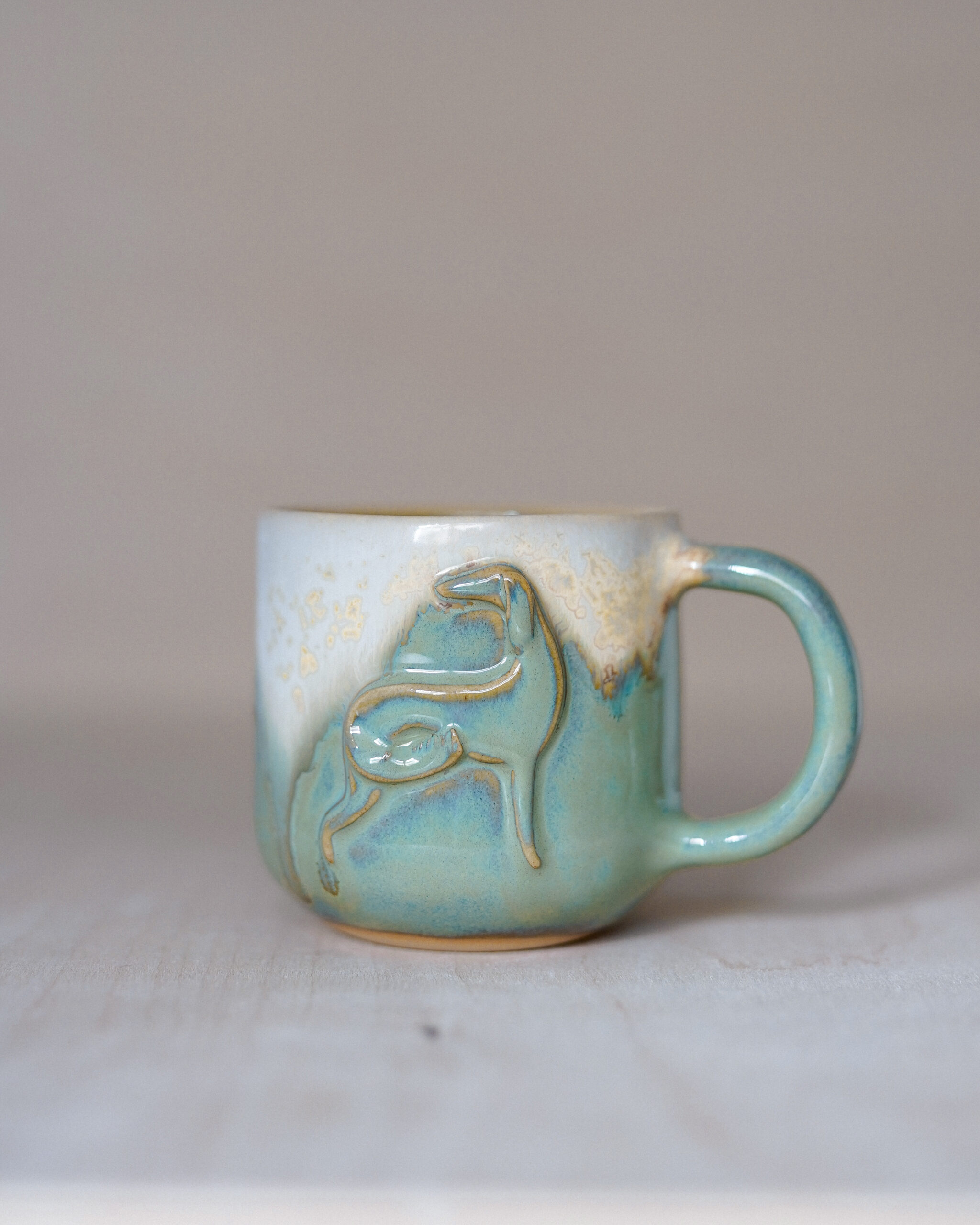 This unique ceramic mug is handmade and decorated with a raised saluki motif on one side, adding character and style. The surface of the mug is covered with glossy glazes – cream and soft turquoise, one fading into another.