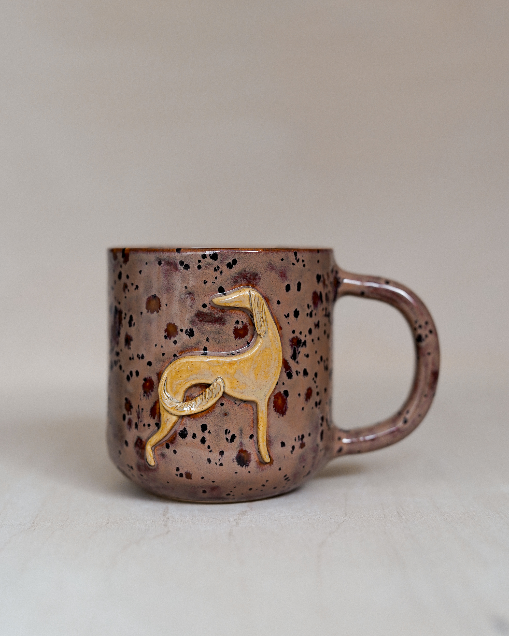 This unique ceramic mug is handmade and decorated with a raised greyhound motif, adding character and style. The surface of the mug is covered with glossy plum-colored glaze, featuring larger amber and smaller black speckles. The interior of the mug has an amber-gold hue, matching the color of the greyhound on the outside.