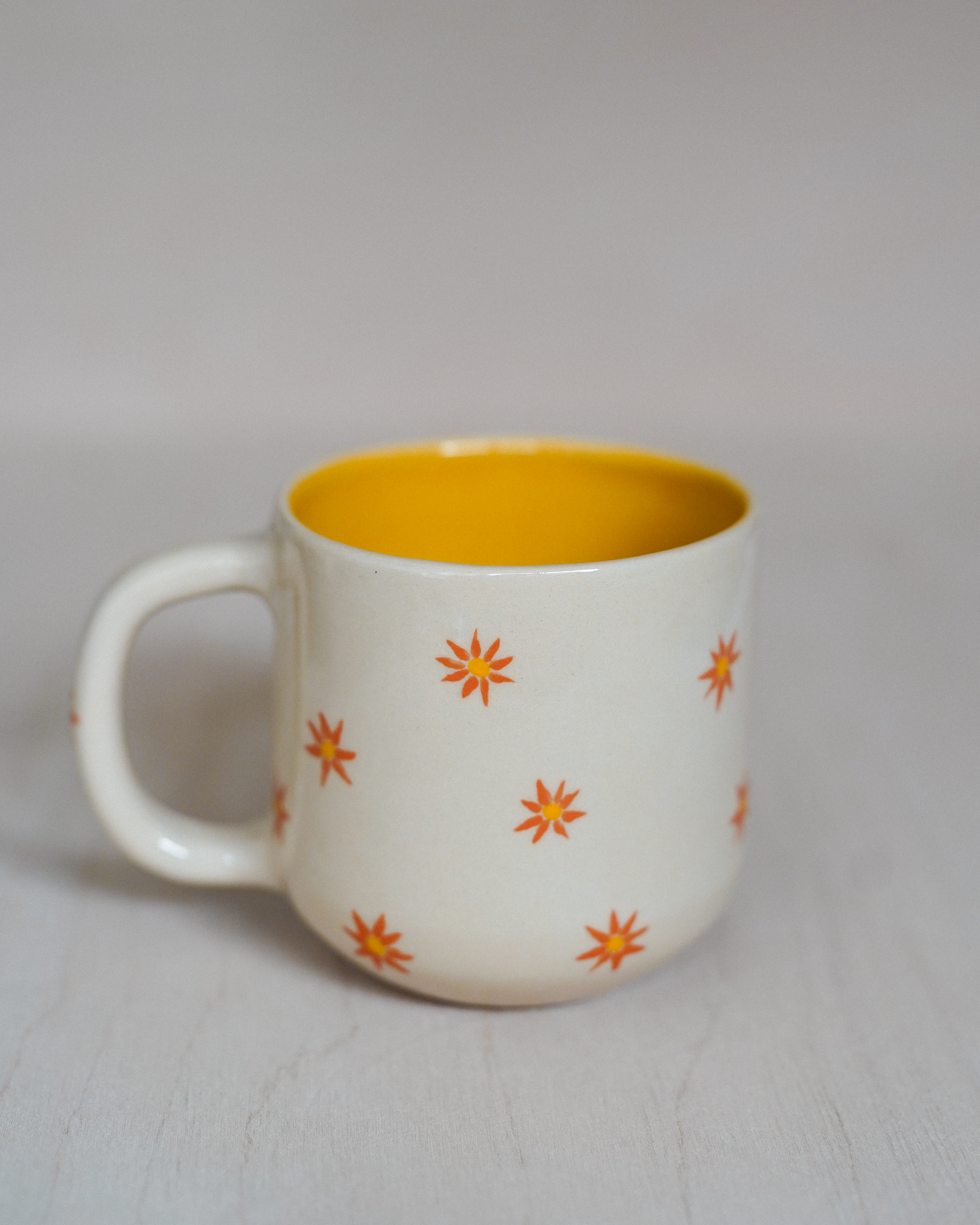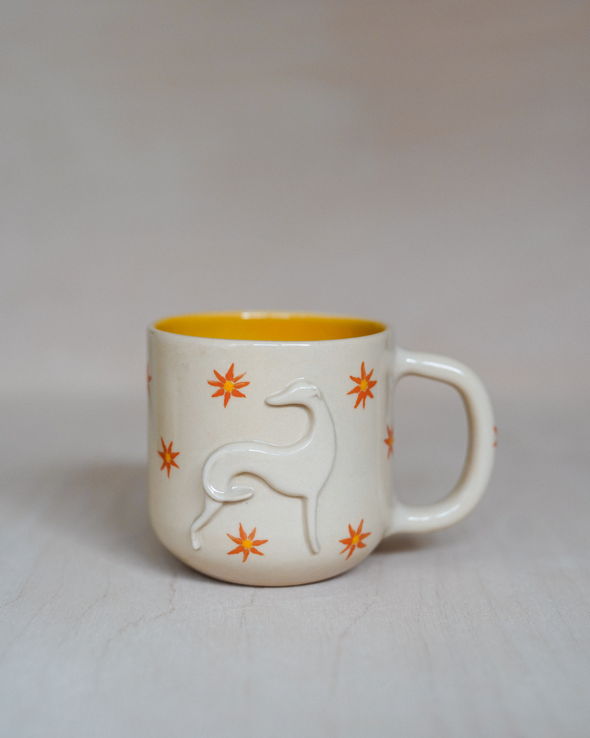 This unique ceramic mug is handmade and decorated with a raised greyhound motif, adding character and style. The surface of the mug is decorated with hand painted in orange-yellow flowers and glazed with transparent glaze. Inside of the mug is covered in yellow, glossy glaze.