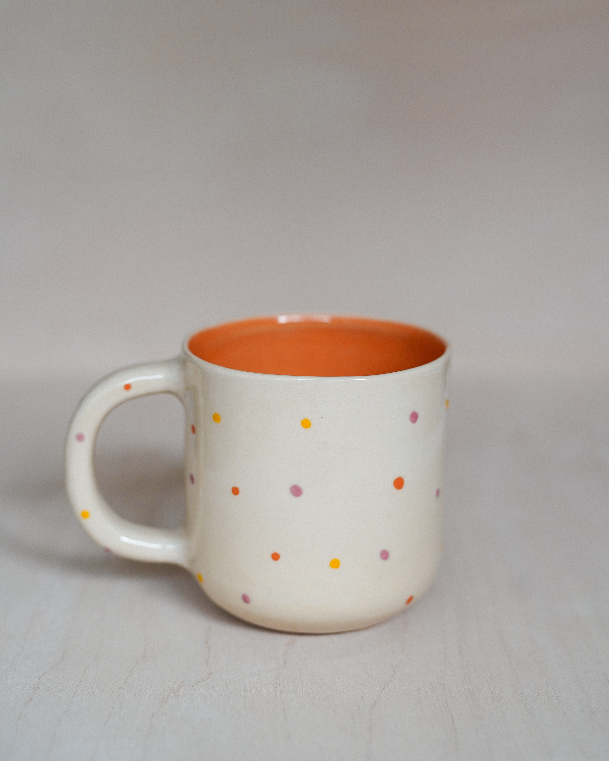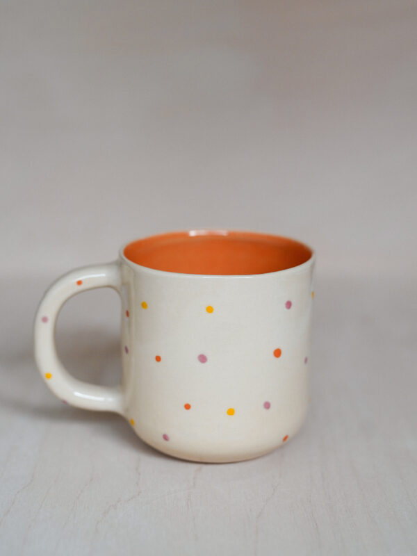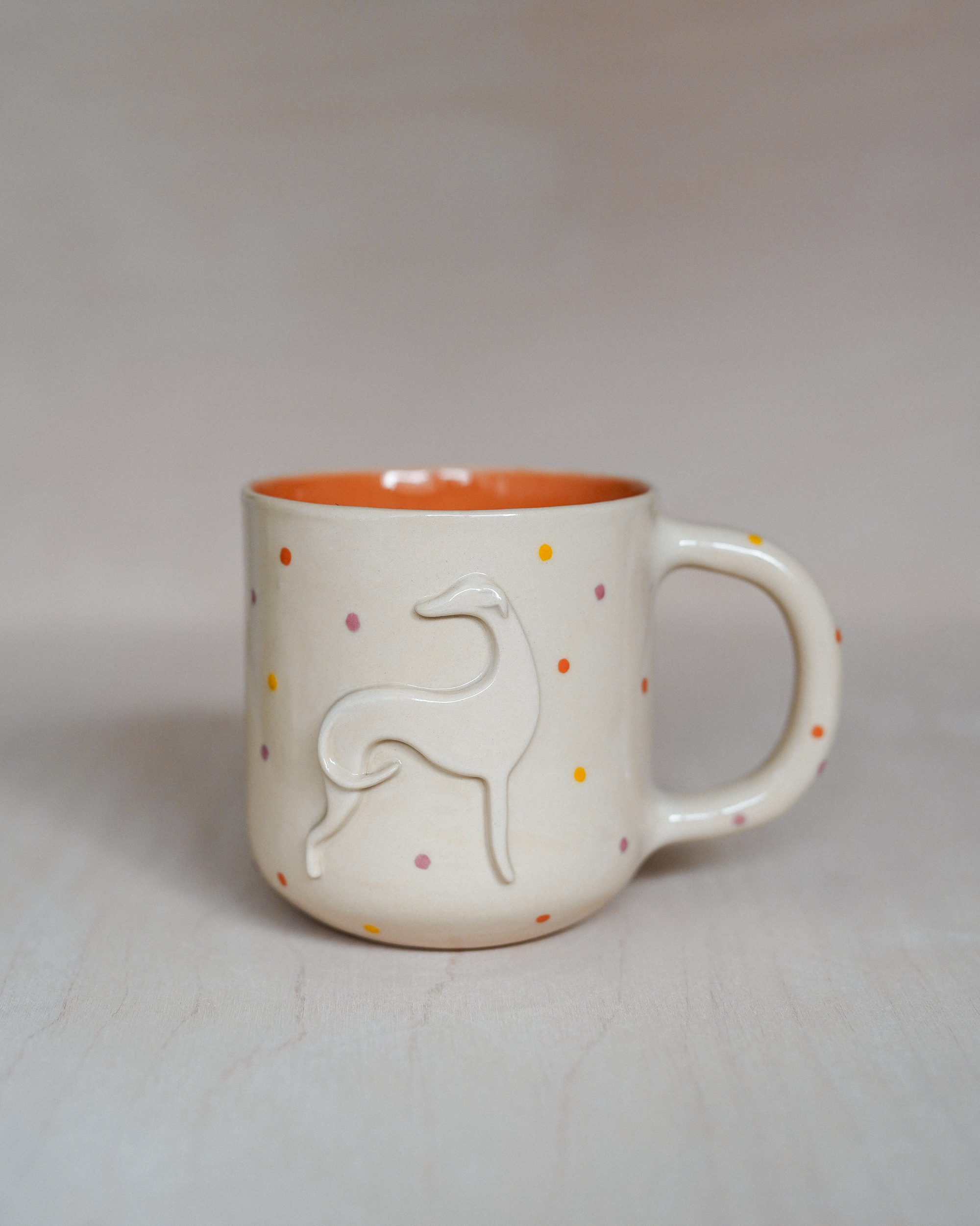 This unique ceramic mug is handmade and decorated with a raised greyhound motif, adding character and style. The surface of the mug is decorated with hand painted in dots and glazed with transparent glaze. Inside of the mug is covered in orange, glossy glaze.