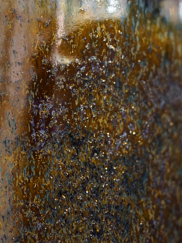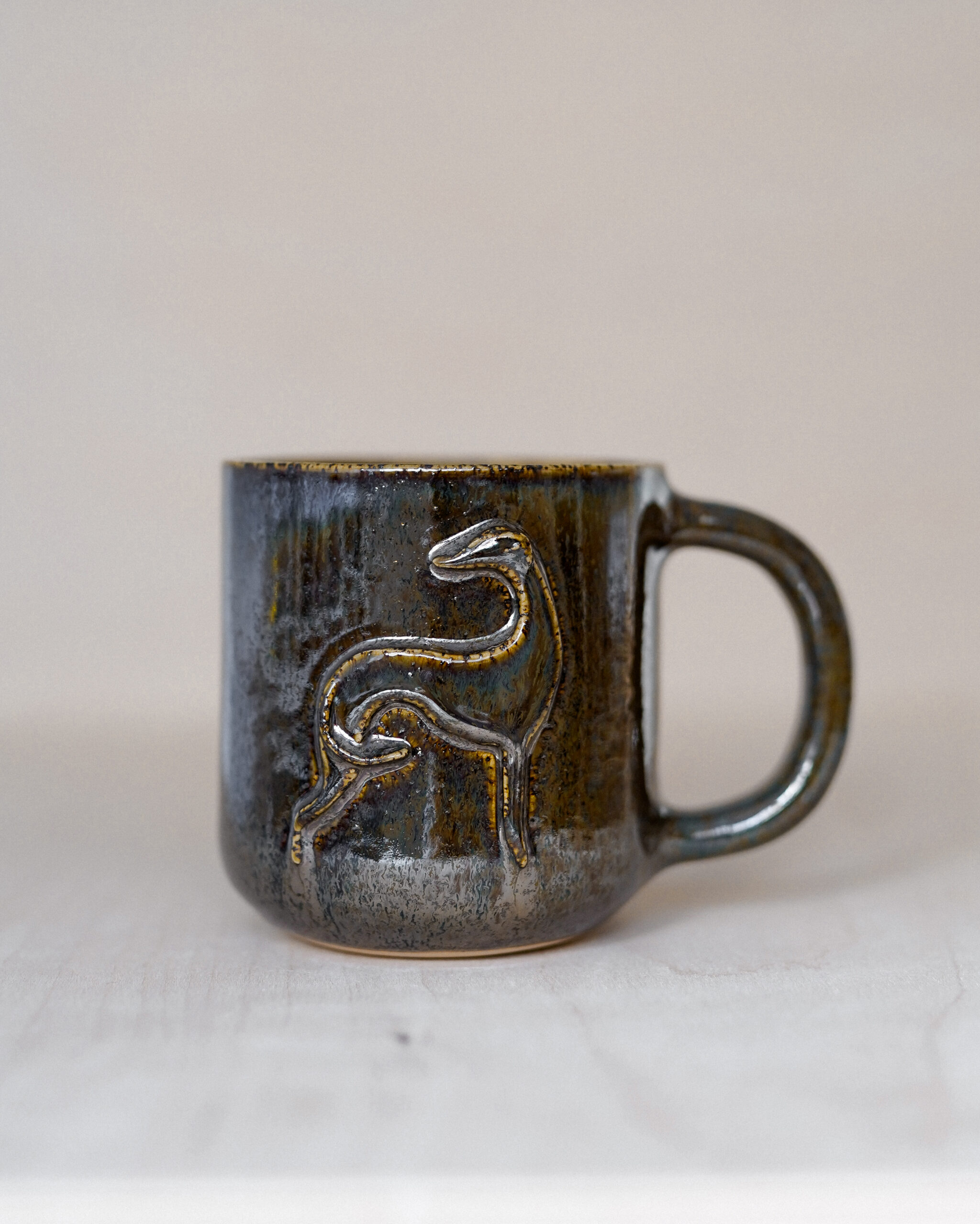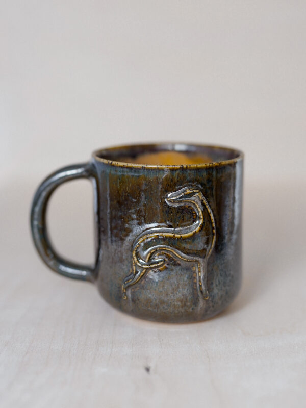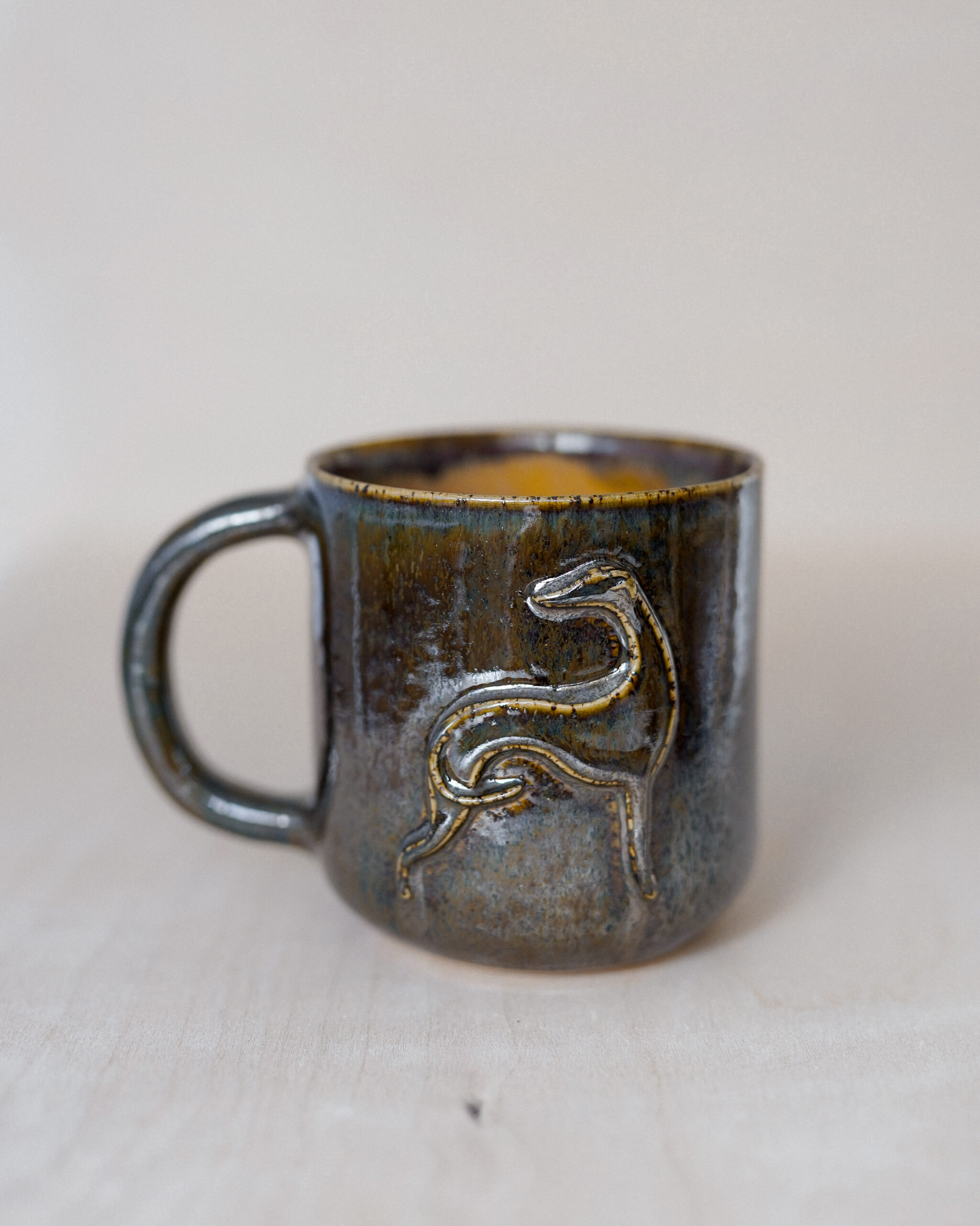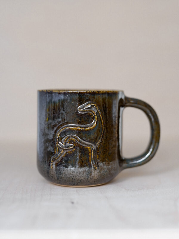 This unique ceramic mug is handmade and decorated with a raised greyhound motif, adding character and style. The surface of the mug (outside) is covered in sparkly, shiny black glaze that changes colour in the sunlight. The inside of the mug is glossy amber-beige.