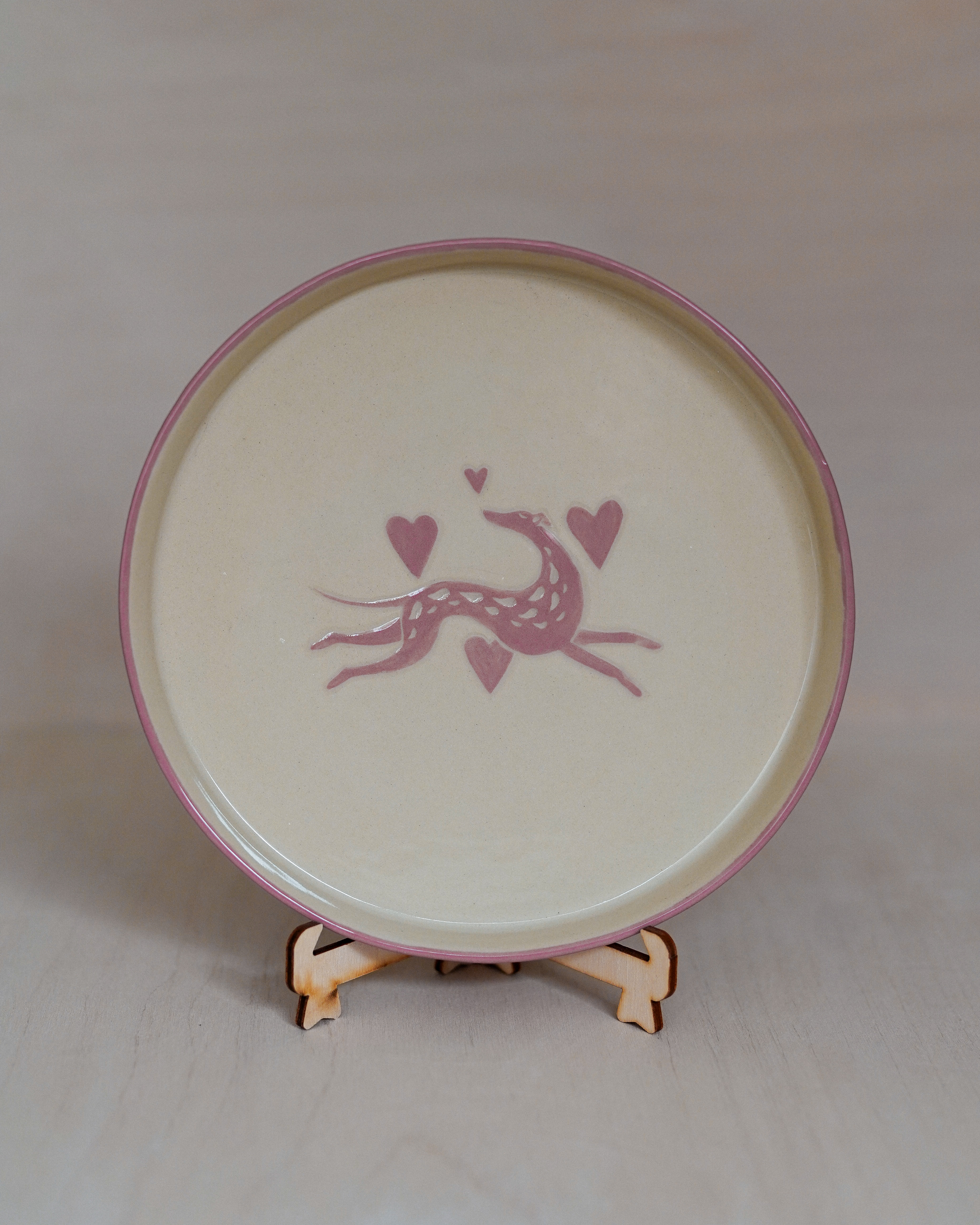 This unique ceramic plate featuring a running greyhound motif has been handmade and decorated using the sgraffito technique. Kept in a pale pink and beige color palette, it is finished with a glossy glaze that beautifully highlights the details of the design.