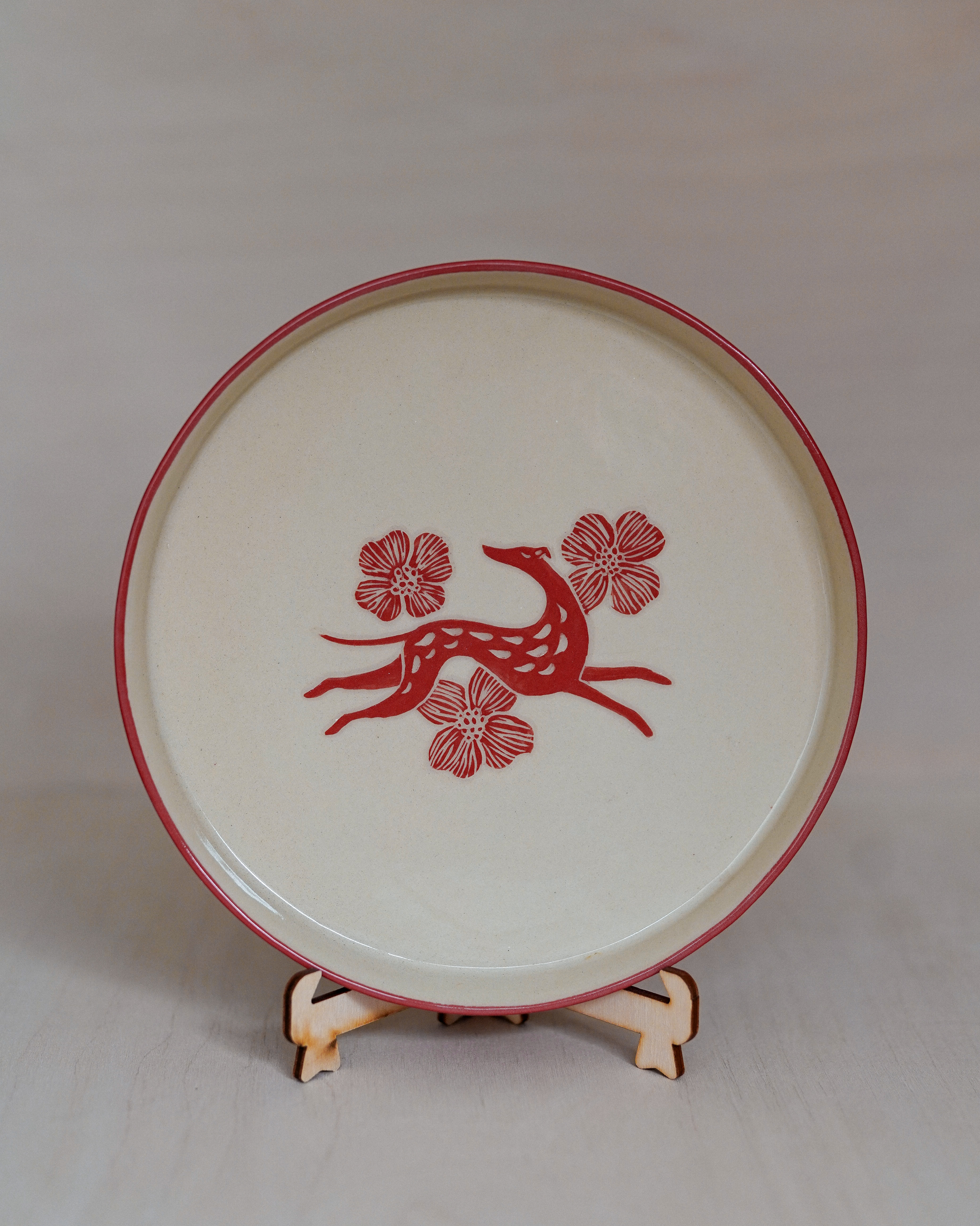 This unique ceramic plate featuring a running greyhound motif has been handmade and decorated using the sgraffito technique. Kept in a red and beige color palette, it is finished with a glossy glaze that beautifully highlights the details of the design.