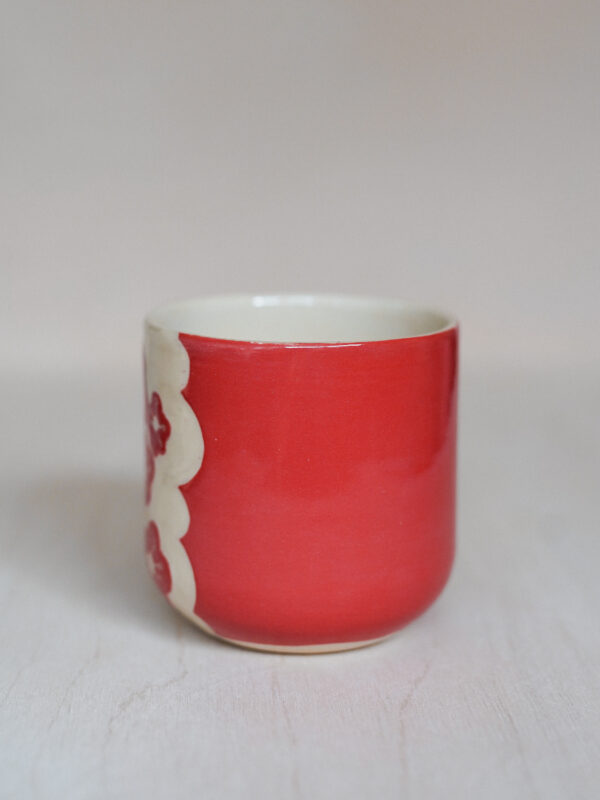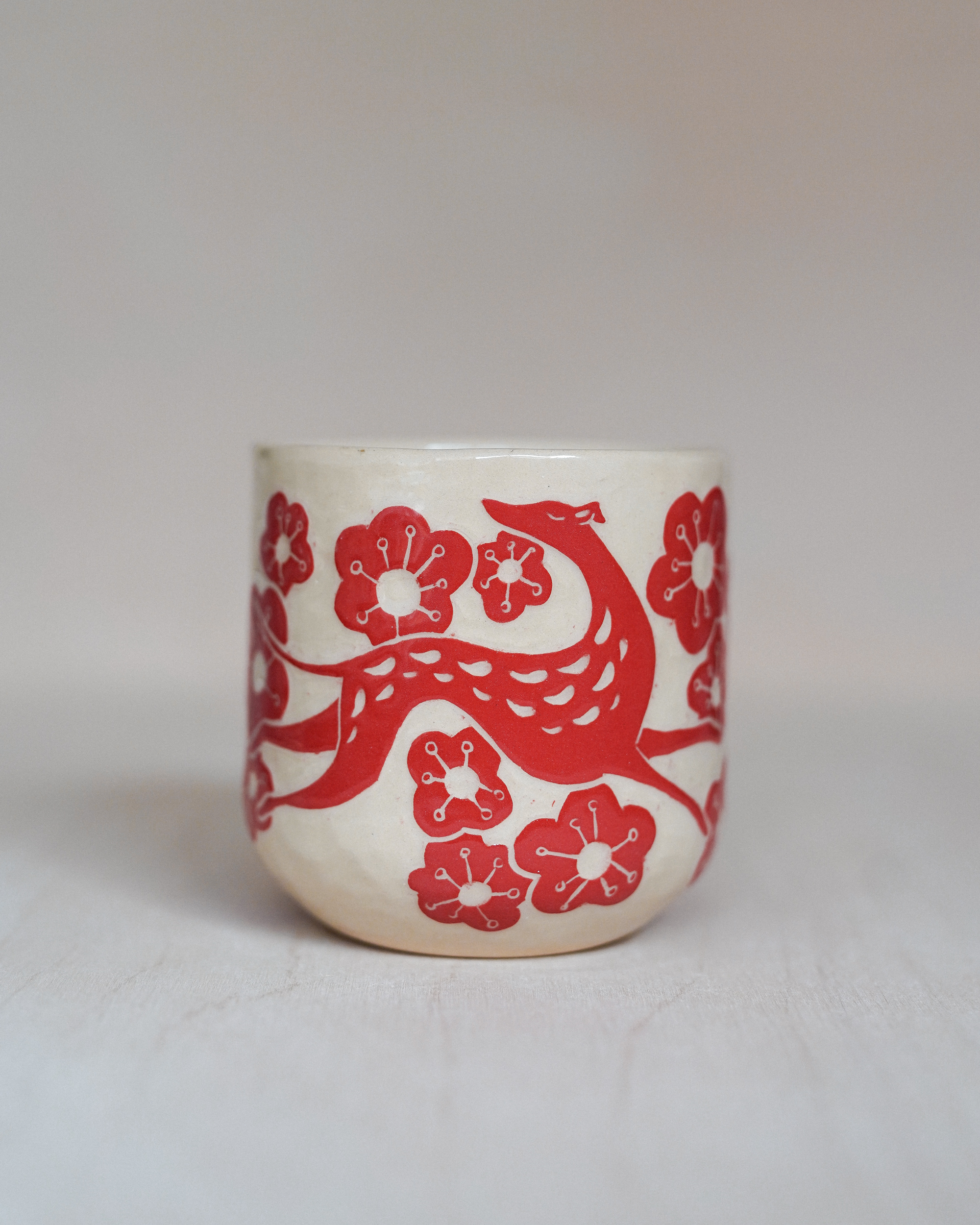 This unique ceramic mug featuring running sighthound is handmade and decorated using a sgraffito technique. It’s red and natural beige, covered with glossy transparent glaze.